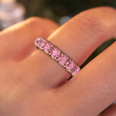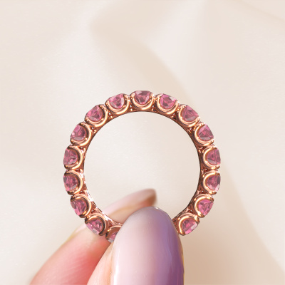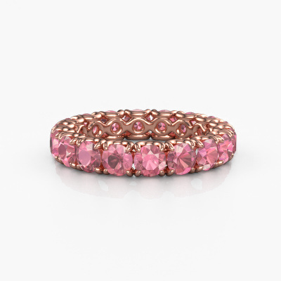 This is our Estee 3.7 ring. This specific type is called an eternity ring and it is set with a continuous line of identically cut gemstones. The ring is made in 14 Carat rose gold and is set with small tourmaline pink, 3.7 mm. The amazing tourmaline pink are identical in size and are set in the ring band. Our tourmaline pink are selected with great care so they are identical, which gives the best result. In order to get the best result, our artisans position all tourmaline pink by hand with the utmost care. Our Goldsmiths have one ambition, which is creating the perfect ring. That is why we love what we do. In the end you get a stunning classic rose gold stackable ring with a row of tourmaline pink which seem to have no beginning nor end. The perfect symbol of your undying love for her! How special is that!After receiving your order, our goldsmiths will passionately start the creative process of making your ring in our own studio. Because we don't have a big stockpile, these costs will not be passed on to you. Our pricing is proof of that! We offer top quality jewels at lowest price, guaranteed.Our talented designers add new designs to our online collection daily. Together they create a diverse collection of the finest jewellery. If you prefer to make a ring according your own design, please feel free to request a quote. We will make you an amazing offer, based on quality and price.To make it easier for you, we offer a 30 day return policy. Check our terms and conditions.