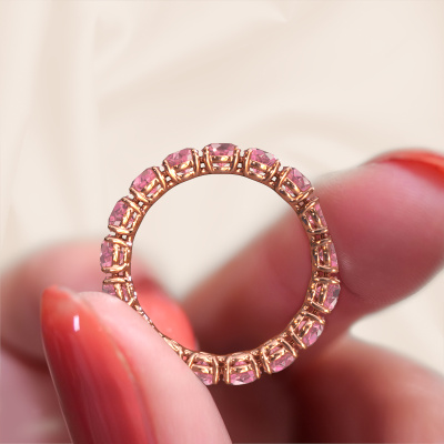This is our Vivienne 3.7 ring. This specific type is called an eternity ring and it is set with a continuous line of identically cut gemstones. The ring is made in 14 Carat rose gold and is set with small tourmaline pink, 3.7 mm. The amazing tourmaline pink are identical in size and are set in the ring band. Our tourmaline pink are selected with great care so they are identical, which gives the best result. In order to get the best result, our artisans position all tourmaline pink by hand with the utmost care. Our Goldsmiths have one ambition, which is creating the perfect ring. That is why we love what we do. In the end you get a stunning classic rose gold stackable ring with a row of tourmaline pink which seem to have no beginning nor end. The perfect symbol of your undying love for her! How special is that!After receiving your order, our goldsmiths will start the creative process of making your Vivienne 3.7 ring. We don't keep stock. This is advantageous because these costs will not be passed on to you. Therefore, we can offer jewellery at exceptionally low prices.New jewellery designs are added to our online collection daily. Our team of passionate designers strive to create extraordinary and diverse designs. Have you seen a ring you like? Please feel free to contact us. Based on a good price/ quality ratio, we will make you an offer you can't refuse!To make it easier for you, we offer a 30 day return policy. Check our terms and conditions.