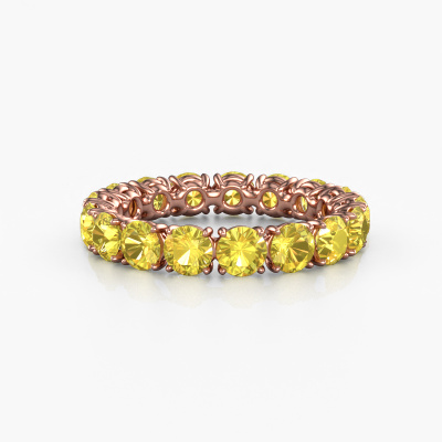 This is our Vivienne 3.7 ring. This specific type is called an eternity ring and it is set with a continuous line of identically cut gemstones. The ring is made in 14 Carat rose gold and is set with small yellow sapphire, 3.7 mm. The amazing yellow sapphire are identical in size and are set in the ring band. Our yellow sapphire are selected with great care so they are identical, which gives the best result. In order to get the best result, our artisans position all yellow sapphire by hand with the utmost care. Our Goldsmiths have one ambition, which is creating the perfect ring. That is why we love what we do. In the end you get a stunning classic rose gold stackable ring with a row of yellow sapphire which seem to have no beginning nor end. The perfect symbol of your undying love for her! How special is that!After receiving your order, our goldsmiths will start the creative process of making your Vivienne 3.7 ring. We don't keep stock. This is advantageous because these costs will not be passed on to you. Therefore, we can offer jewellery at exceptionally low prices.New jewellery designs are added to our online collection daily. Our team of passionate designers strive to create extraordinary and diverse designs. Have you seen a ring you like? Please feel free to contact us. Based on a good price/ quality ratio, we will make you an offer you can't refuse!To make it easier for you, we offer a 30 day return policy. Check our terms and conditions.