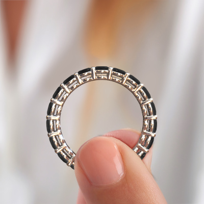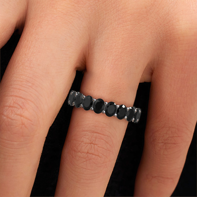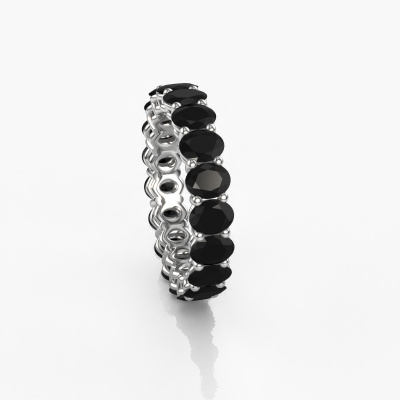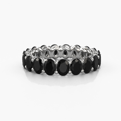 This is our Heddy OVL 3.5x4.5 ring. This specific type is called an eternity ring and it is set with a continuous line of identically cut gemstones. The ring is made in 14 Carat white gold and is set with small black diamonds, 4.788 crt. The amazing black diamonds are identical in size and are set in the ring band. Our black diamonds are selected with great care so they are identical, which gives the best result. In order to get the best result, our artisans position all black diamonds by hand with the utmost care. Our Goldsmiths have one ambition, which is creating the perfect ring. That is why we love what we do. In the end you get a stunning fantasy white gold stackable ring with a row of black diamonds which seem to have no beginning nor end. The perfect symbol of your undying love for her! How special is that!By using a combination of the latest modern techniques, combined with ancient crafting, we can make all our rings in our own studio. Each jewel is made to order. This is advantageous because we can offer you a price you won't find anywhere else.Our team of talented, passionate designers add new ring designs to our online collection daily. Our objective in doing so, is to be able to offer you a wide variety of jewels. Please feel free to request a quote if you have specific wishes for your ring. We guarantee to make you an offer you can't refuse.To make it easier for you, we offer a 30 day return policy. Check our terms and conditions.