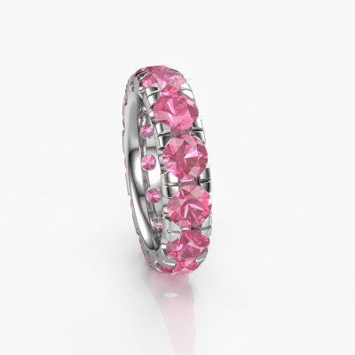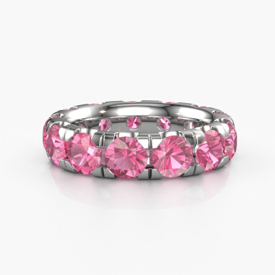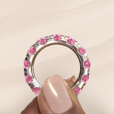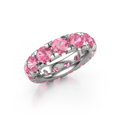 This is our Jackie 5.0 ring. This specific type is called an eternity ring and it is set with a continuous line of identically cut gemstones. The ring is made in 14 Carat white gold and is set with small pink sapphire, 5 mm. The amazing pink sapphire are identical in size and are set in the ring band. Our pink sapphire are selected with great care so they are identical, which gives the best result. In order to get the best result, our artisans position all pink sapphire by hand with the utmost care. Our Goldsmiths have one ambition, which is creating the perfect ring. That is why we love what we do. In the end you get a stunning exclusive white gold stackable ring with a row of pink sapphire which seem to have no beginning nor end. The perfect symbol of your undying love for her! How special is that!After receiving your order, our goldsmiths will passionately start the creative process of making your ring in our own studio. Because we don't have a big stockpile, these costs will not be passed on to you. Our pricing is proof of that! We offer top quality jewels at lowest price, guaranteed.Our talented designers add new designs to our online collection daily. Together they create a diverse collection of the finest jewellery. If you prefer to make a ring according your own design, please feel free to request a quote. We will make you an amazing offer, based on quality and price.To make it easier for you, we offer a 30 day return policy. Check our terms and conditions.