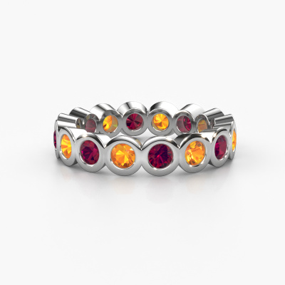This is our Edwina 3 ring. This specific type is called an eternity ring and it is set with a continuous line of identically cut gemstones. The ring is made in 14 Carat white gold and is set with small rhodolite, 3 mm. The amazing rhodolite are identical in size and are set in the ring band. Our rhodolite are selected with great care so they are identical, which gives the best result. In order to get the best result, our artisans position all rhodolite by hand with the utmost care. Our Goldsmiths have one ambition, which is creating the perfect ring. That is why we love what we do. In the end you get a stunning trendy white gold stackable ring with a row of rhodolite which seem to have no beginning nor end. The perfect symbol of your undying love for her! How special is that!After receiving your order, our goldsmiths will passionately start the creative process of making your ring in our own studio. Because we don't have a big stockpile, these costs will not be passed on to you. Our pricing is proof of that! We offer top quality jewels at lowest price, guaranteed.Our team of talented, passionate designers add new ring designs to our online collection daily. Our objective in doing so, is to be able to offer you a wide variety of jewels. Please feel free to request a quote if you have specific wishes for your ring. We guarantee to make you an offer you can't refuse.To make it easier for you, we offer a 30 day return policy. Check our terms and conditions.