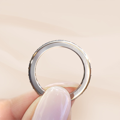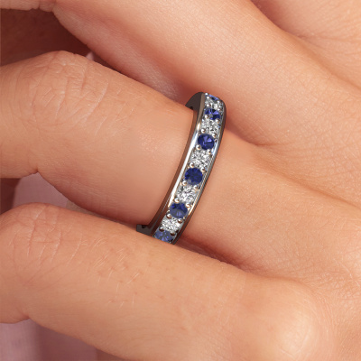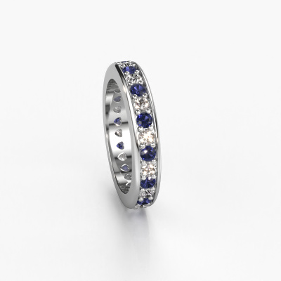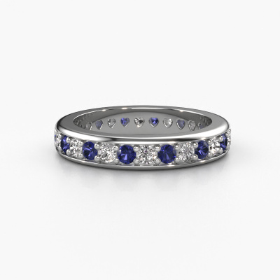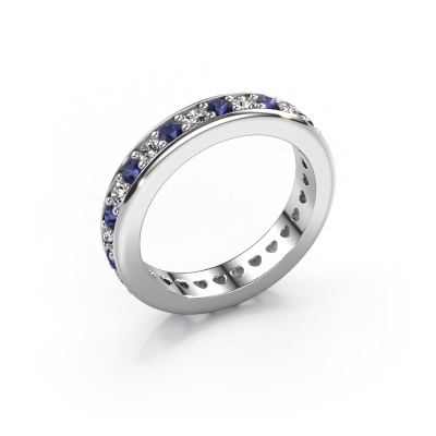 This is our Nienke ring. This specific type is called an eternity ring and it is set with a continuous line of identically cut gemstones. The ring is made in 14 Carat white gold and is set with small sapphire, 2.2 mm. The amazing sapphire are identical in size and are set in the ring band. Our sapphire are selected with great care so they are identical, which gives the best result. In order to get the best result, our artisans position all sapphire by hand with the utmost care. Our Goldsmiths have one ambition, which is creating the perfect ring. That is why we love what we do. In the end you get a stunning modern white gold stackable ring with a row of sapphire which seem to have no beginning nor end. The perfect symbol of your undying love for her! How special is that!After receiving your order, our goldsmiths will start the creative process of making your Nienke ring. We don't keep stock. This is advantageous because these costs will not be passed on to you. Therefore, we can offer jewellery at exceptionally low prices.Our team of talented, passionate designers add new ring designs to our online collection daily. Our objective in doing so, is to be able to offer you a wide variety of jewels. Please feel free to request a quote if you have specific wishes for your ring. We guarantee to make you an offer you can't refuse.To make it easier for you, we offer a 30 day return policy. Check our terms and conditions.