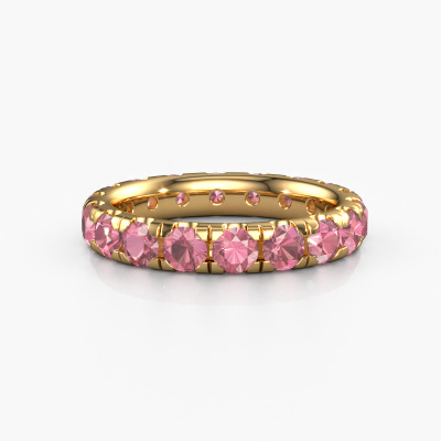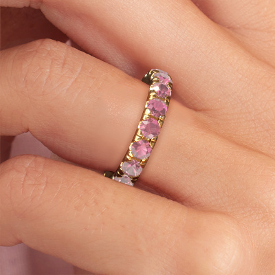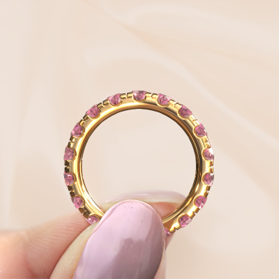 This is our Jackie 3.4 ring. This specific type is called an eternity ring and it is set with a continuous line of identically cut gemstones. The ring is made in 14 Carat gold and is set with small tourmaline pink, 3.4 mm. This gold Eternity ring is