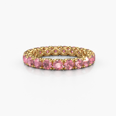This is our Estee 2.9 ring. This specific type is called an eternity ring and it is set with a continuous line of identically cut gemstones. The ring is made in 14 Carat gold and is set with small tourmaline pink, 2.9 mm. This gold Eternity ring is a perfectly beautiful and meaningful way to give your proposal that special touch. The magnificent evenly shaped tourmaline pink are pave set around the ring. The identical tourmaline pink are carefully selected to give the ring a maximum effect. Do keep in mind we use natural resources so small differences between stones are common. The special effect is enhanced due to precise positioning of the tourmaline pink. This requires the utmost precision and a skilful hand but for our skilled artisans this is what excites them. The result is a stackable ring with a row of tourmaline pink which seem to have no beginning nor end. The perfect symbol of your love for her! Isn't she a beauty?Because we design and deliver our own rings, we can offer you a ring at a price you won't find anywhere else. A ring is made to order, which helps prevent excess supplies, so we can make you a great price offer. We understand it feels risky, buying your ring online, but we will gladly assist in the designing process, taking your budget into consideration.Our team of talented, passionate designers add new ring designs to our online collection daily. Our objective in doing so, is to be able to offer you a wide variety of jewels. Please feel free to request a quote if you have specific wishes for your ring. We guarantee to make you an offer you can't refuse.To make it easier for you, we offer a 30 day return policy. Check our terms and conditions.