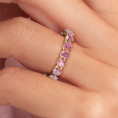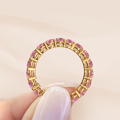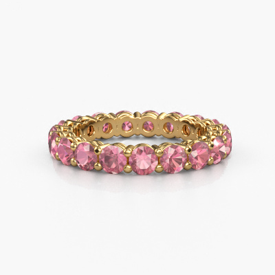 This is our Michelle full 3.4 ring. This specific type is called an eternity ring and it is set with a continuous line of identically cut gemstones. The ring is made in 14 Carat gold and is set with small tourmaline pink, 3.4 mm. This gold Eternity ring is a perfectly beautiful and meaningful way to give your proposal that special touch. The magnificent evenly shaped tourmaline pink are pave set around the ring. The identical tourmaline pink are carefully selected to give the ring a maximum effect. Do keep in mind we use natural resources so small differences between stones are common. The special effect is enhanced due to precise positioning of the tourmaline pink. This requires the utmost precision and a skilful hand but for our skilled artisans this is what excites them. The result is a stackable ring with a row of tourmaline pink which seem to have no beginning nor end. The perfect symbol of your love for her! Isn't she a beauty?By using a combination of the latest modern techniques, combined with ancient crafting, we can make all our rings in our own studio. Each jewel is made to order. This is advantageous because we can offer you a price you won't find anywhere else.New jewellery designs are added to our online collection daily. Our team of passionate designers strive to create extraordinary and diverse designs. Have you seen a ring you like? Please feel free to contact us. Based on a good price/ quality ratio, we will make you an offer you can't refuse!To make it easier for you, we offer a 30 day return policy. Check our terms and conditions.
