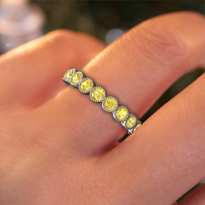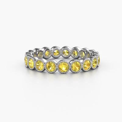 This is our Mariam 0.07 ring. This specific type is called an eternity ring and it is set with a continuous line of identically cut gemstones. The ring is made in 14 Carat white gold and is set with small yellow sapphire, 2.7 mm. The amazing yellow sapphire are identical in size and are set in the ring band. Our yellow sapphire are selected with great care so they are identical, which gives the best result. In order to get the best result, our artisans position all yellow sapphire by hand with the utmost care. Our Goldsmiths have one ambition, which is creating the perfect ring. That is why we love what we do. In the end you get a stunning trendy white gold ring with a row of yellow sapphire which seem to have no beginning nor end. The perfect symbol of your undying love for her! How special is that!After receiving your order, our goldsmiths will passionately start the creative process of making your ring in our own studio. Because we don't have a big stockpile, these costs will not be passed on to you. Our pricing is proof of that! We offer top quality jewels at lowest price, guaranteed.Our talented designers add new designs to our online collection daily. Together they create a diverse collection of the finest jewellery. If you prefer to make a ring according your own design, please feel free to request a quote. We will make you an amazing offer, based on quality and price.To make it easier for you, we offer a 30 day return policy. Check our terms and conditions.