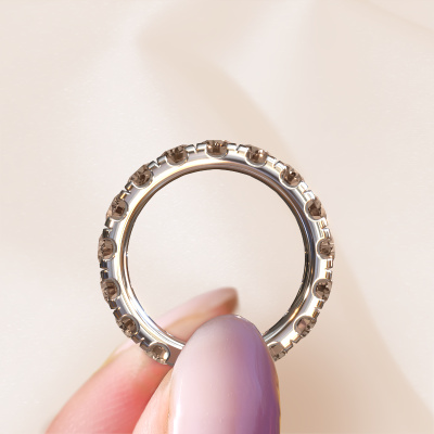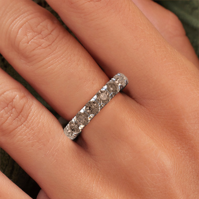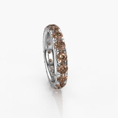 This is our Jackie 3.7 ring. This specific type is called an eternity ring and it is set with a continuous line of identically cut gemstones. The ring is made in 14 Carat white gold and is set with small brown diamonds, 3.40 crt. The amazing brown diamonds are identical in size and are set in the ring band. Our brown diamonds are selected with great care so they are identical, which gives the best result. In order to get the best result, our artisans position all brown diamonds by hand with the utmost care. Our Goldsmiths have one ambition, which is creating the perfect ring. That is why we love what we do. In the end you get a stunning modern white gold stackable ring with a row of brown diamonds which seem to have no beginning nor end. The perfect symbol of your undying love for her! How special is that!By using our modern techniques, we can design and customize the finest quality jewels with the utmost care for you. Our rings are always priced 30 percent lower than other jewellers. We make rings to order, so we don't have to maintain a large stock. If you have a certain budget, we are more than happy to advice you accordingly.New jewellery designs are added to our online collection daily. Our team of passionate designers strive to create extraordinary and diverse designs. Have you seen a ring you like? Please feel free to contact us. Based on a good price/ quality ratio, we will make you an offer you can't refuse!To make it easier for you, we offer a 30 day return policy. Check our terms and conditions.