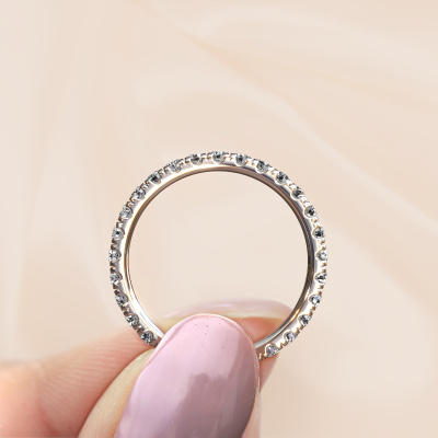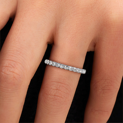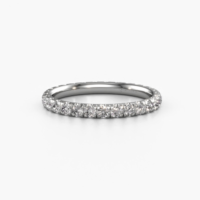 This is our Jackie 2.0 ring. This specific type is called an eternity ring and it is set with a continuous line of identically cut gemstones. The ring is made in 14 Carat white gold and is set with small diamonds, 0.87 crt. The amazing diamonds are identical in size and are set in the ring band. Our diamonds are selected with great care so they are identical, which gives the best result. In order to get the best result, our artisans position all diamonds by hand with the utmost care. Our Goldsmiths have one ambition, which is creating the perfect ring. That is why we love what we do. In the end you get a stunning modern white gold stackable ring with a row of diamonds which seem to have no beginning nor end. The perfect symbol of your undying love for her! How special is that!By using our modern techniques, we can design and customize the finest quality jewels with the utmost care for you. Our rings are always priced 30 percent lower than other jewellers. We make rings to order, so we don't have to maintain a large stock. If you have a certain budget, we are more than happy to advice you accordingly.New jewellery designs are added to our online collection daily. Our team of passionate designers strive to create extraordinary and diverse designs. Have you seen a ring you like? Please feel free to contact us. Based on a good price/ quality ratio, we will make you an offer you can't refuse!To make it easier for you, we offer a 30 day return policy. Check our terms and conditions.