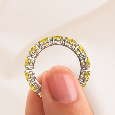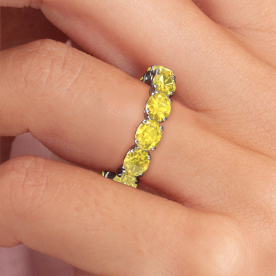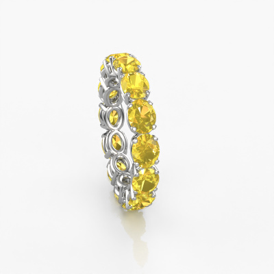 This is our Vivienne OVL 5x4 ring. This specific type is called an eternity ring and it is set with a continuous line of identically cut gemstones. The ring is made in 14 Carat white gold and is set with small yellow sapphire, 5x4 mm. This white gold Eternity ring is a perfectly beautiful and meaningful way to give your proposal that special touch. The magnificent evenly shaped yellow sapphire are pave set around the ring. The identical yellow sapphire are carefully selected to give the ring a maximum effect. Do keep in mind we use natural resources so small differences between stones are common. The special effect is enhanced due to precise positioning of the yellow sapphire. This requires the utmost precision and a skilful hand but for our skilled artisans this is what excites them. The result is a ring with a row of yellow sapphire which seem to have no beginning nor end. The perfect symbol of your love for her! Isn't she a beauty?By using our modern techniques, we can design and customize the finest quality jewels with the utmost care for you. Our rings are always priced 30 percent lower than other jewellers. We make rings to order, so we don't have to maintain a large stock. If you have a certain budget, we are more than happy to advice you accordingly.New jewellery designs are added to our online collection daily. Our team of passionate designers strive to create extraordinary and diverse designs. Have you seen a ring you like? Please feel free to contact us. Based on a good price/ quality ratio, we will make you an offer you can't refuse!To make it easier for you, we offer a 30 day return policy. Check our terms and conditions.