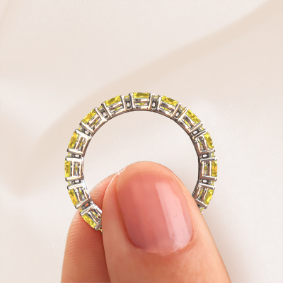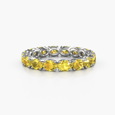 This is our Vivienne OVL 4x3 ring. This specific type is called an eternity ring and it is set with a continuous line of identically cut gemstones. The ring is made in 14 Carat white gold and is set with small yellow sapphire, 4x3 mm. This white gold Eternity ring is a perfectly beautiful and meaningful way to give your proposal that special touch. The magnificent evenly shaped yellow sapphire are pave set around the ring. The identical yellow sapphire are carefully selected to give the ring a maximum effect. Do keep in mind we use natural resources so small differences between stones are common. The special effect is enhanced due to precise positioning of the yellow sapphire. This requires the utmost precision and a skilful hand but for our skilled artisans this is what excites them. The result is a ring with a row of yellow sapphire which seem to have no beginning nor end. The perfect symbol of your love for her! Isn't she a beauty?Because we design and deliver our own rings, we can offer you a ring at a price you won't find anywhere else. A ring is made to order, which helps prevent excess supplies, so we can make you a great price offer. We understand it feels risky, buying your ring online, but we will gladly assist in the designing process, taking your budget into consideration.Our team of talented, passionate designers add new ring designs to our online collection daily. Our objective in doing so, is to be able to offer you a wide variety of jewels. Please feel free to request a quote if you have specific wishes for your ring. We guarantee to make you an offer you can't refuse.To make it easier for you, we offer a 30 day return policy. Check our terms and conditions.