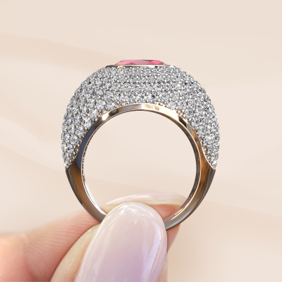 Are you looking for a pavé set ring with an eye-catching single gemstone? How do you like this Armida ring? This platinum Armida ring is set with a beautiful 9x7 mm oval tourmaline pink. The tourmaline pink is carefully selected by our tourmaline pink suppliers. Subsequently, these gemstones are then set by our goldsmith according to ancient tradition. The ring will then be polished to perfection creating a unique ring with a stunning tourmaline pink. Created especially for you. How do you like this exclusive platinum ring? Simply customize this Armida ring, using our online tool. Subsequently, your personal pavé set Armida ring will be made by hand by our goldsmiths. Precious metals and gemstones can be customized to your liking. Do you have specific preferences which are unavailable in our online tool? Please feel free to contact us. We will customize your personal exclusive ring to your liking.Because we design and deliver our own rings, we can offer you a ring at a price you won't find anywhere else. A ring is made to order, which helps prevent excess supplies, so we can make you a great price offer. We understand it feels risky, buying your ring online, but we will gladly assist in the designing process, taking your budget into consideration.To make it easier for you, we offer a 30 day return policy. Check our terms and conditions.