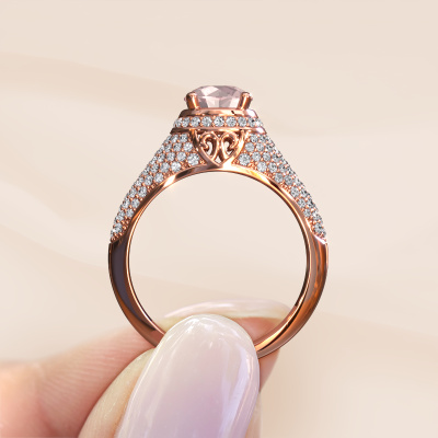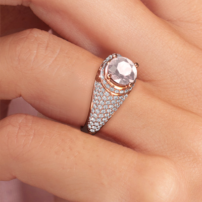 This exclusive rose gold Sharee ring is a true work of art! This ring is made of 14 Carat rose gold and is set with 6.5 mm round morganite champagne. The smallest ornaments are crafted by our goldsmith with a lot of patience and great passion. In order to create this ring with great precision, this craft requires a keen eye and a skilful hand. A challenge which ignites a fire in our expert goldsmiths. The exquisite morganite champagne are set in a way that their unique qualities are strengthened. This gives the ring an even more glamorous appearance. The ring is unique by itself though, because of the natural birthstones we selected especially for this Sharee ring. And by choosing the precious metal yourself, you create a unique ring. The special sharee ring, as shown here, can be customized to your liking. Our online tool offers many different options but please feel free to contact us if you want changes made to your sharee ring, which are unavailable in our online tool.Because we design and deliver our own rings, we can offer you a ring at a price you won't find anywhere else. A ring is made to order, which helps prevent excess supplies, so we can make you a great price offer. We understand it feels risky, buying your ring online, but we will gladly assist in the designing process, taking your budget into consideration.To make it easier for you, we offer a 30 day return policy. Check our terms and conditions.