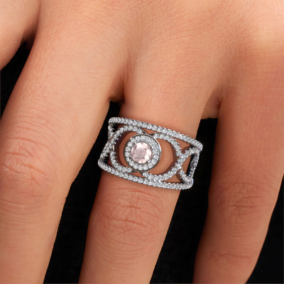 This exclusive white gold Regina ring is a true work of art! This ring is made of 14 Carat white gold and is set with 4.2 mm round morganite champagne. The smallest ornaments are crafted by our goldsmith with a lot of patience and great passion. In order to create this ring with great precision, this craft requires a keen eye and a skilful hand. A challenge which ignites a fire in our expert goldsmiths. The exquisite morganite champagne are set in a way that their unique qualities are strengthened. This gives the ring an even more glamorous appearance. The ring is unique by itself though, because of the natural birthstones we selected especially for this Regina ring. And by choosing the precious metal yourself, you create a unique ring. How do you like this exclusive white gold ring? Simply customize this Regina ring, using our online tool. Subsequently, your personal special Regina ring will be made by hand by our goldsmiths. Precious metals and gemstones can be customized to your liking. Do you have specific preferences which are unavailable in our online tool? Please feel free to contact us. We will customize your personal exclusive ring to your liking.By using our modern techniques, we can design and customize the finest quality jewels with the utmost care for you. Our rings are always priced 30 percent lower than other jewellers. We make rings to order, so we don't have to maintain a large stock. If you have a certain budget, we are more than happy to advice you accordingly.To make it easier for you, we offer a 30 day return policy. Check our terms and conditions.