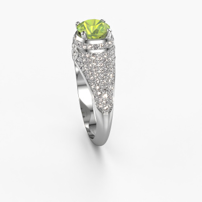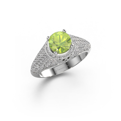 This exclusive white gold Sharee ring is a true work of art! This ring is made of 14 Carat white gold and is set with 6.5 mm round peridot. The smallest ornaments are crafted by our goldsmith with a lot of patience and great passion. In order to create this ring with great precision, this craft requires a keen eye and a skilful hand. A challenge which ignites a fire in our expert goldsmiths. The exquisite peridot are set in a way that their unique qualities are strengthened. This gives the ring an even more glamorous appearance. The ring is unique by itself though, because of the natural birthstones we selected especially for this Sharee ring. And by choosing the precious metal yourself, you create a unique ring. The special sharee ring, as shown here, can be customized to your liking. Our online tool offers many different options but please feel free to contact us if you want changes made to your sharee ring, which are unavailable in our online tool.Because we design and deliver our own rings, we can offer you a ring at a price you won't find anywhere else. A ring is made to order, which helps prevent excess supplies, so we can make you a great price offer. We understand it feels risky, buying your ring online, but we will gladly assist in the designing process, taking your budget into consideration.To make it easier for you, we offer a 30 day return policy. Check our terms and conditions.