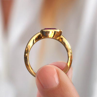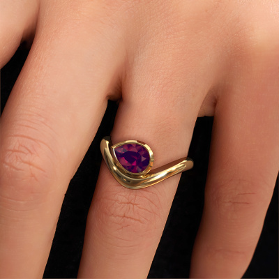 This ring called Lena is made of 14 Carat gold and is set with rhodolite. Are you in the market for a unique gold ring with a modern twist? Then this ring might suit you. Simply customize to your or her liking. It suits the contemporary modern