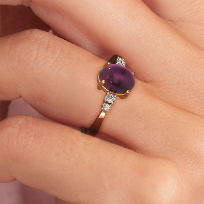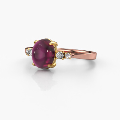 In this photo the rose gold Jelke ring is set with a cabochon rhodolite. Cabochon means a rhodolite is shaped first, not faceted, into a specific shape, such as a drop, heart or oval cabochon. Subsequently, it is polished until the gemstone has a orb shaped surface. A cabochon gemstone is a stunning, classy eye-catcher that matches perfectly with a contemporary as well as a vintage style. Our expert goldsmiths shape the daring ring to perfection which makes it unique. The cabochon rhodolite is set so its unique qualities are strengthened. Customize your own daringJelke ring, which will then be created by our goldsmiths with great passion. Do you prefer a different option than is shown here in the rose gold Jelke ring? Then our online tools offers various options. Feel free to ask us for help if you are unable to succeed. We are happy to answer your questions!By using our modern techniques, we can design and customize the finest quality jewels with the utmost care for you. Our rings are always priced 30 percent lower than other jewellers. We make rings to order, so we don't have to maintain a large stock. If you have a certain budget, we are more than happy to advice you accordingly.To make it easier for you, we offer a 30 day return policy. Check our terms and conditions.