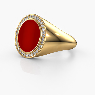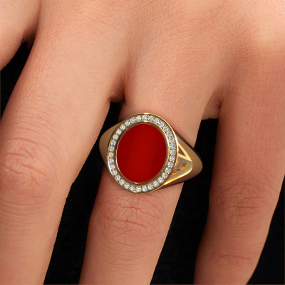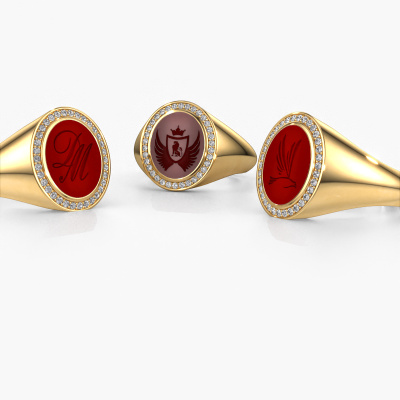 This gold women´s signet ring is a true work of art! This is our best price Hilda 2 signet ring and it is set with a oval shape carnelian. In our crafting studio, we use a combination of the latest techniques and ancient traditional craftsmanship, so we are able to create a detailed perfect signet ring. Our expert goldsmiths are fascinated by signet rings. The signet ring can be engraved with initials or a family weapon. Signet rings with family weapons can be handed down from generation to generation and that usually is the case. On top of that, a signet ring is a beautiful, classy piece of jewellery which is trending once more. More than one reason to start or extend the tradition. Please browse our online database for more options on engravings. You can find the departments of our education centre at the bottom of this page. Our goldsmiths passionately create your customized signet ring to your liking with the utmost care. The gold signet ring, as shown here, can be customized using our online tool. Feel free to ask our jewel designers for assistance if you want changes made which are unavailable in our online tool. We are happy to answer your questions.After receiving your order, our goldsmiths will start the creative process of making your Hilda 2 ring. We don't keep stock. This is advantageous because these costs will not be passed on to you. Therefore, we can offer jewellery at exceptionally low prices.To make it easier for you, we offer a 30 day return policy. Check our terms and conditions.