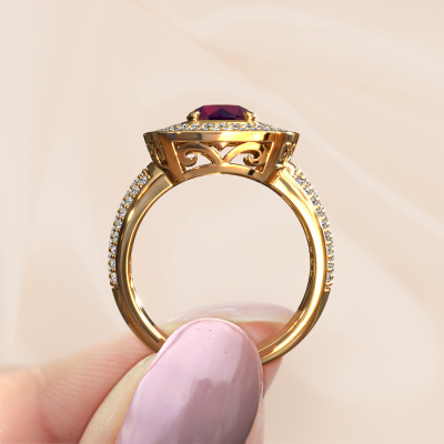 This exclusive gold Eliana ring is a true work of art! This ring is made of 14 Carat gold and is set with 6 mm round rhodolite. The smallest ornaments are crafted by our goldsmith with a lot of patience and great passion. In order to create this ring with great precision, this craft requires a keen eye and a skilful hand. A challenge which ignites a fire in our expert goldsmiths. The exquisite rhodolite are set in a way that their unique qualities are strengthened. This gives the ring an even more glamorous appearance. The ring is unique by itself though, because of the natural birthstones we selected especially for this Eliana ring. And by choosing the precious metal yourself, you create a unique ring. As soon as you finished designing your Eliana ring with our online tool, our goldsmiths will start their creative process of making your ring. This will be done with passion and care, according ancient crafting. On top of that, our jewels are made of eco-friendly materials. Simply customize online with our online tool, if you want any changes made. If you want specific changes made to your Eliana ring, that are unavailable in our online tool, please feel free to contact our expert designers.By using a combination of the latest modern techniques, combined with ancient crafting, we can make all our rings in our own studio. Each jewel is made to order. This is advantageous because we can offer you a price you won't find anywhere else.To make it easier for you, we offer a 30 day return policy. Check our terms and conditions.