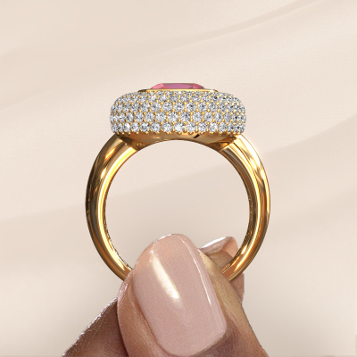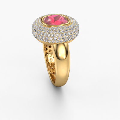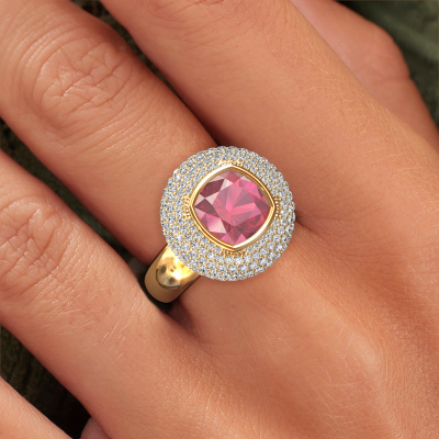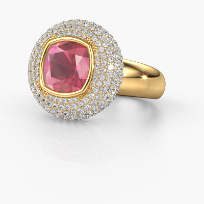 This exclusive gold Keshia ring is a true work of art! This ring is made of 14 Carat gold and is set with 8 mm cushion tourmaline pink. The smallest ornaments are crafted by our goldsmith with a lot of patience and great passion. In order to create this ring with great precision, this craft requires a keen eye and a skilful hand. A challenge which ignites a fire in our expert goldsmiths. The exquisite tourmaline pink are set in a way that their unique qualities are strengthened. This gives the ring an even more glamorous appearance. The ring is unique by itself though, because of the natural birthstones we selected especially for this Keshia ring. And by choosing the precious metal yourself, you create a unique ring. Our goldsmiths passionately create your customized ring to your liking with the utmost care. The gold ring, as shown here, can be customized using our online tool. Feel free to ask our jewel designers for assistance if you want changes made which are unavailable in our online tool. We are happy to answer your questions.By using our modern techniques, we can design and customize the finest quality jewels with the utmost care for you. Our rings are always priced 30 percent lower than other jewellers. We make rings to order, so we don't have to maintain a large stock. If you have a certain budget, we are more than happy to advice you accordingly.To make it easier for you, we offer a 30 day return policy. Check our terms and conditions.