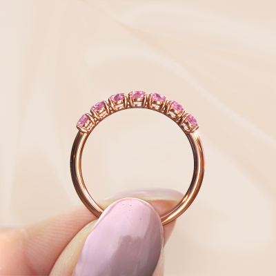 How would you describe your own style? Are you looking for something uniquely different? This half eternity rose gold Vivienne Half ring is astonishing! Simply customize to your or her own liking. This ring is set with pink sapphire. These pink sapphire have been carefully selected because your ring must be adorned with nothing but the most beautiful gemstone. Wouldn't you agree? Our expert goldsmith will create your ring in our own crafting studios, where the pink sapphire will be set with care. The ring will then be polished to perfection to give it that extra sparkle. It's a perfect ring for a woman of excellent taste!As soon as you finished designing your Vivienne Half ring with our online tool, our goldsmiths will start their creative process of making your ring. This will be done with passion and care, according ancient crafting. On top of that, our jewels are made of eco-friendly materials. Simply customize online with our online tool, if you want any changes made. If you want specific changes made to your Vivienne Half ring, that are unavailable in our online tool, please feel free to contact our expert designers.By using our modern techniques, we can design and customize the finest quality jewels with the utmost care for you. Our rings are always priced 30 percent lower than other jewellers. We make rings to order, so we don't have to maintain a large stock. If you have a certain budget, we are more than happy to advice you accordingly.To make it easier for you, we offer a 30 day return policy. Check our terms and conditions.