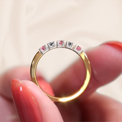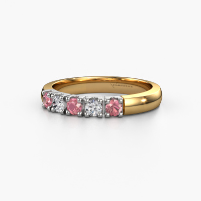 This extraordinary ring is called Rianne 5. This type of ring is known as a memoire ring, because its gemstones are set in a continuous line. This makes it easy to combine with other rings. The band of this 14 Carat gold ring is set in a combination of tourmaline pink and diamond 2.7 mm. You can easily choose the combination you prefer online. As you can see, a single tourmaline pink is set in this single alliance gold ring. The memoire ring represents collaboration. And that is precisely what these gemstones do, collaborate. Together they add a beautiful effect to the band of a classic ring! Such a meaningful ring, wouldn't you agree? All our hand selected tourmaline pink are positioned by hand by our expert goldsmith. It's a precise task, which can only be completed successfully through the combination of pure craftsmanship and usage of the latest techniques which give it an optimal effect. To create a perfect reflection of light, all the gemstones have to be perfectly aligned in the same way. During manufacturing, the expert goldsmith will therefore monitor the reflection of light constantly to check whether the tourmaline pink are aligned properly. This requires a skilled hand and a lot of patience but then the end product will be a true piece of art. And that is our mission!By using a combination of the latest modern techniques, combined with ancient crafting, we can make all our rings in our own studio. Each jewel is made to order. This is advantageous because we can offer you a price you won't find anywhere else.