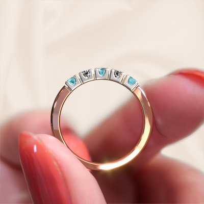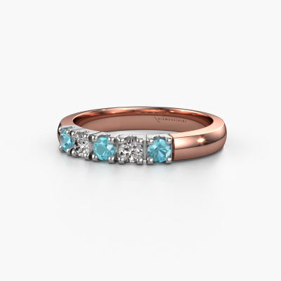 This extraordinary ring is called Rianne 5. This type of ring is known as a memoire ring, because its gemstones are set in a continuous line. This makes it easy to combine with other rings. The band of this 14 Carat rose gold ring is set in a combination of blue topaz and diamond 2.7 mm. You can easily choose the combination you prefer online. As you can see, a single blue topaz is set in this single alliance rose gold ring. The memoire ring represents collaboration. And that is precisely what these gemstones do, collaborate. Together they add a beautiful effect to the band of a classic ring! Such a meaningful ring, wouldn't you agree? All our hand selected blue topaz are positioned by hand by our expert goldsmith. It's a precise task, which can only be completed successfully through the combination of pure craftsmanship and usage of the latest techniques which give it an optimal effect. To create a perfect reflection of light, all the gemstones have to be perfectly aligned in the same way. During manufacturing, the expert goldsmith will therefore monitor the reflection of light constantly to check whether the blue topaz are aligned properly. This requires a skilled hand and a lot of patience but then the end product will be a true piece of art. And that is our mission!By using a combination of the latest modern techniques, combined with ancient crafting, we can make all our rings in our own studio. Each jewel is made to order. This is advantageous because we can offer you a price you won't find anywhere else.