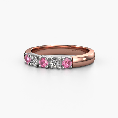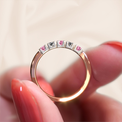 This extraordinary ring is called Rianne 5. This type of ring is known as a memoire ring, because its gemstones are set in a continuous line. This makes it easy to combine with other rings. The band of this 14 Carat rose gold ring is set in a combination of pink sapphire and diamond 2.7 mm. You can easily choose the combination you prefer online. As you can see, a single pink sapphire is set in this single alliance rose gold ring. The memoire ring represents collaboration. And that is precisely what these gemstones do, collaborate. Together they add a beautiful effect to the band of a classic ring! Such a meaningful ring, wouldn't you agree? All our hand selected pink sapphire are positioned by hand by our expert goldsmith. It's a precise task, which can only be completed successfully through the combination of pure craftsmanship and usage of the latest techniques which give it an optimal effect. To create a perfect reflection of light, all the gemstones have to be perfectly aligned in the same way. During manufacturing, the expert goldsmith will therefore monitor the reflection of light constantly to check whether the pink sapphire are aligned properly. This requires a skilled hand and a lot of patience but then the end product will be a true piece of art. And that is our mission!By using a combination of the latest modern techniques, combined with ancient crafting, we can make all our rings in our own studio. Each jewel is made to order. This is advantageous because we can offer you a price you won't find anywhere else.