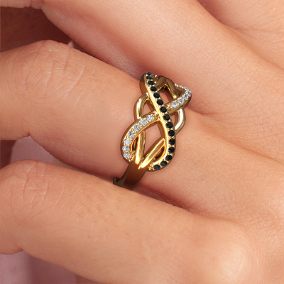 How would you describe your own style? Are you looking for something uniquely different? This infinity gold Lizan ring is astonishing! Simply customize to your or her own liking. This ring is set with black diamond. These black diamonds have been carefully selected because your ring must be adorned with nothing but the most beautiful gemstone. Wouldn't you agree? Our expert goldsmith will create your ring in our own crafting studios, where the black diamond will be set with care. The ring will then be polished to perfection to give it that extra sparkle. It's a perfect ring for a woman of excellent taste!As soon as you finished designing your Lizan ring with our online tool, our goldsmiths will start their creative process of making your ring. This will be done with passion and care, according ancient crafting. On top of that, our jewels are made of eco-friendly materials. Simply customize online with our online tool, if you want any changes made. If you want specific changes made to your Lizan ring, that are unavailable in our online tool, please feel free to contact our expert designers.Because we design and deliver our own rings, we can offer you a ring at a price you won't find anywhere else. A ring is made to order, which helps prevent excess supplies, so we can make you a great price offer. We understand it feels risky, buying your ring online, but we will gladly assist in the designing process, taking your budget into consideration.To make it easier for you, we offer a 30 day return policy. Check our terms and conditions.