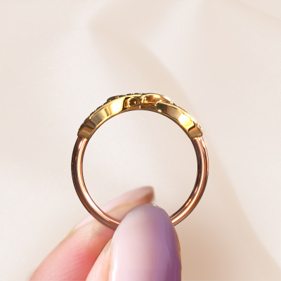 How would you describe your own style? Are you looking for something uniquely different? This infinity rose gold Yael ring is astonishing! Simply customize to your or her own liking. This ring is set with black diamond. These black diamonds have been carefully selected because your ring must be adorned with nothing but the most beautiful gemstone. Wouldn't you agree? Our expert goldsmith will create your ring in our own crafting studios, where the black diamond will be set with care. The ring will then be polished to perfection to give it that extra sparkle. It's a perfect ring for a woman of excellent taste!Customize your own infinityYael ring, which will then be created by our goldsmiths with great passion. Do you prefer a different option than is shown here in the rose gold Yael ring? Then our online tools offers various options. Feel free to ask us for help if you are unable to succeed. We are happy to answer your questions!By using a combination of the latest modern techniques, combined with ancient crafting, we can make all our rings in our own studio. Each jewel is made to order. This is advantageous because we can offer you a price you won't find anywhere else.To make it easier for you, we offer a 30 day return policy. Check our terms and conditions.