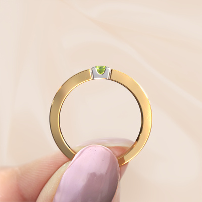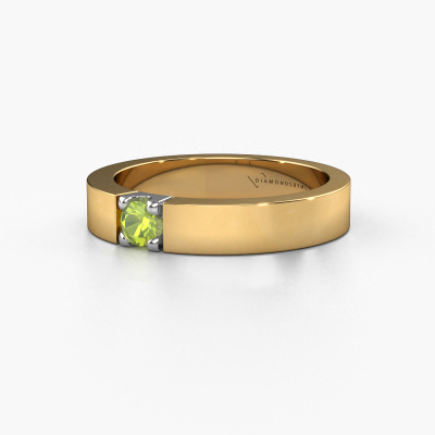 This extraordinary ring is called Dana 1. This type of ring is known as a memoire ring, because it's birthstones are set in a continuous line. This makes it easy to combine with other rings. The band of this 14 Carat gold ring is set in a combination of peridot and peridot 3.7 mm. You can easily choose the combination you prefer online. As you can see, a single peridot is set in this single alliance gold ring. The memoire ring represents collaboration. And that is precisely what these gemstones do, collaborate. Together they add a beautiful effect to the band of a modern ring! Such a meaningful ring, wouldn't you agree? All our hand selected peridot are positioned by hand by our expert goldsmith. It's a precise task, which can only be completed successfully through the combination of pure craftsmanship and usage of the latest techniques which give it an optimal effect. To create a perfect reflection of light, all the gemstones have to be perfectly aligned in the same way. During manufacturing, the expert goldsmith will therefore monitor the reflection of light constantly to check whether the peridot are aligned properly. This requires a skilled hand and a lot of patience but then the end product will be a true piece of art. And that is our mission!After receiving your order, our goldsmiths will passionately start the creative process of making your ring in our own studio. Because we don't have a big stockpile, these costs will not be passed on to you. Our pricing is proof of that! We offer top quality jewels at lowest price, guaranteed.Our team of talented, passionate designers add new ring designs to our online collection daily. Our objective in doing so, is to be able to offer you a wide variety of jewels. Please feel free to request a quote if you have specific wishes for your ring. We guarantee to make you an offer you can't refuse.To make it easier for you, we offer a 30 day return policy. Check our terms and conditions.