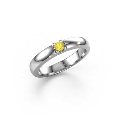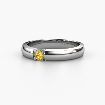 This extraordinary ring is called Rianne 1. This type of ring is known as a memoire ring, because it's birthstones are set in a continuous line. This makes it easy to combine with other rings. The band of this platinum ring is set in a combination of yellow sapphire and yellow sapphire 3 mm. You can easily choose the combination you prefer online. As you can see, a single yellow sapphire is set in this single alliance platinum ring. The memoire ring represents collaboration. And that is precisely what these gemstones do, collaborate. Together they add a beautiful effect to the band of a classic ring! Such a meaningful ring, wouldn't you agree? All our hand selected yellow sapphire are positioned by hand by our expert goldsmith. It's a precise task, which can only be completed successfully through the combination of pure craftsmanship and usage of the latest techniques which give it an optimal effect. To create a perfect reflection of light, all the gemstones have to be perfectly aligned in the same way. During manufacturing, the expert goldsmith will therefore monitor the reflection of light constantly to check whether the yellow sapphire are aligned properly. This requires a skilled hand and a lot of patience but then the end product will be a true piece of art. And that is our mission!By using a combination of the latest modern techniques, combined with ancient crafting, we can make all our rings in our own studio. Each jewel is made to order. This is advantageous because we can offer you a price you won't find anywhere else.Our team of talented, passionate designers add new ring designs to our online collection daily. Our objective in doing so, is to be able to offer you a wide variety of jewels. Please feel free to request a quote if you have specific wishes for your ring. We guarantee to make you an offer you can't refuse.To make it easier for you, we offer a 30 day return policy. Check our terms and conditions.