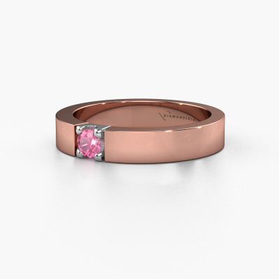 This extraordinary ring is called Dana 1. This type of ring is known as a memoire ring, because it's birthstones are set in a continuous line. This makes it easy to combine with other rings. The band of this 14 Carat rose gold ring is set in a combination of pink sapphire and pink sapphire 3.7 mm. You can easily choose the combination you prefer online. As you can see, a single pink sapphire is set in this single alliance rose gold ring. The memoire ring represents collaboration. And that is precisely what these gemstones do, collaborate. Together they add a beautiful effect to the band of a modern ring! Such a meaningful ring, wouldn't you agree? All our hand selected pink sapphire are positioned by hand by our expert goldsmith. It's a precise task, which can only be completed successfully through the combination of pure craftsmanship and usage of the latest techniques which give it an optimal effect. To create a perfect reflection of light, all the gemstones have to be perfectly aligned in the same way. During manufacturing, the expert goldsmith will therefore monitor the reflection of light constantly to check whether the pink sapphire are aligned properly. This requires a skilled hand and a lot of patience but then the end product will be a true piece of art. And that is our mission!After receiving your order, our goldsmiths will passionately start the creative process of making your ring in our own studio. Because we don't have a big stockpile, these costs will not be passed on to you. Our pricing is proof of that! We offer top quality jewels at lowest price, guaranteed.Our team of talented, passionate designers add new ring designs to our online collection daily. Our objective in doing so, is to be able to offer you a wide variety of jewels. Please feel free to request a quote if you have specific wishes for your ring. We guarantee to make you an offer you can't refuse.To make it easier for you, we offer a 30 day return policy. Check our terms and conditions.