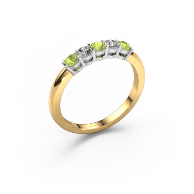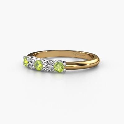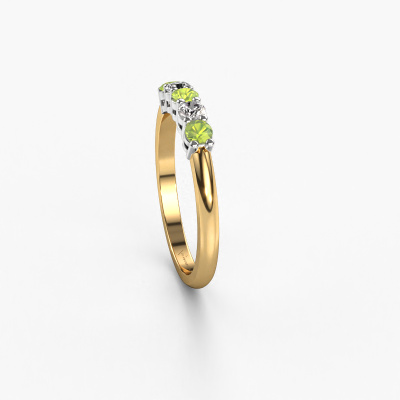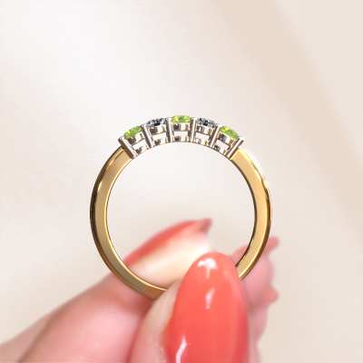 This extraordinary ring is called Michelle 5. This type of ring is known as a memoire ring, because its gemstones are set in a continuous line. This makes it easy to combine with other rings. The band of this 14 Carat gold ring is set in a combination of peridot and lab grown diamond 3 mm. You can easily choose the combination you prefer online. As you can see, a single peridot is set in this single alliance gold ring. The memoire ring represents collaboration. And that is precisely what these gemstones do, collaborate. Together they add a beautiful effect to the band of a classic ring! Such a meaningful ring, wouldn't you agree? All our hand selected peridot are positioned by hand by our expert goldsmith. It's a precise task, which can only be completed successfully through the combination of pure craftsmanship and usage of the latest techniques which give it an optimal effect. To create a perfect reflection of light, all the gemstones have to be perfectly aligned in the same way. During manufacturing, the expert goldsmith will therefore monitor the reflection of light constantly to check whether the peridot are aligned properly. This requires a skilled hand and a lot of patience but then the end product will be a true piece of art. And that is our mission!Are you on a budget? Please feel free to contact us, so we can go discuss your options. We offer our rings at guaranteed best price, because we make them to order. You won't find such a price anywhere else!