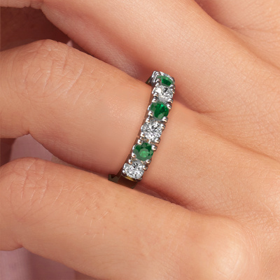 This extraordinary ring is called Rianne 7. This type of ring is known as a memoire ring, because its gemstones are set in a continuous line. This makes it easy to combine with other rings. The band of this 14 Carat gold ring is set in a combination of emerald and lab grown diamond 3 mm. You can easily choose the combination you prefer online. As you can see, a single emerald is set in this single alliance gold ring. The memoire ring represents collaboration. And that is precisely what these gemstones do, collaborate. Together they add a beautiful effect to the band of a traditional ring! Such a meaningful ring, wouldn't you agree? All our hand selected emerald are positioned by hand by our expert goldsmith. It's a precise task, which can only be completed successfully through the combination of pure craftsmanship and usage of the latest techniques which give it an optimal effect. To create a perfect reflection of light, all the gemstones have to be perfectly aligned in the same way. During manufacturing, the expert goldsmith will therefore monitor the reflection of light constantly to check whether the emerald are aligned properly. This requires a skilled hand and a lot of patience but then the end product will be a true piece of art. And that is our mission!Because we design and deliver our own rings, we can offer you a ring at a price you won't find anywhere else. A ring is made to order, which helps prevent excess supplies, so we can make you a great price offer. We understand it feels risky, buying your ring online, but we will gladly assist in the designing process, taking your budget into consideration.