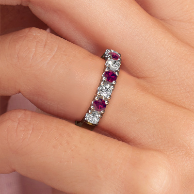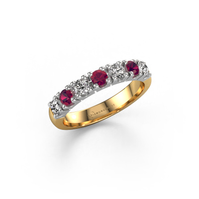 This extraordinary ring is called Rianne 7. This type of ring is known as a memoire ring, because its gemstones are set in a continuous line. This makes it easy to combine with other rings. The band of this 14 Carat gold ring is set in a combination of rhodolite and lab grown diamond 3 mm. You can easily choose the combination you prefer online. As you can see, a single rhodolite is set in this single alliance gold ring. The memoire ring represents collaboration. And that is precisely what these gemstones do, collaborate. Together they add a beautiful effect to the band of a traditional ring! Such a meaningful ring, wouldn't you agree? All our hand selected rhodolite are positioned by hand by our expert goldsmith. It's a precise task, which can only be completed successfully through the combination of pure craftsmanship and usage of the latest techniques which give it an optimal effect. To create a perfect reflection of light, all the gemstones have to be perfectly aligned in the same way. During manufacturing, the expert goldsmith will therefore monitor the reflection of light constantly to check whether the rhodolite are aligned properly. This requires a skilled hand and a lot of patience but then the end product will be a true piece of art. And that is our mission!Because we design and deliver our own rings, we can offer you a ring at a price you won't find anywhere else. A ring is made to order, which helps prevent excess supplies, so we can make you a great price offer. We understand it feels risky, buying your ring online, but we will gladly assist in the designing process, taking your budget into consideration.
