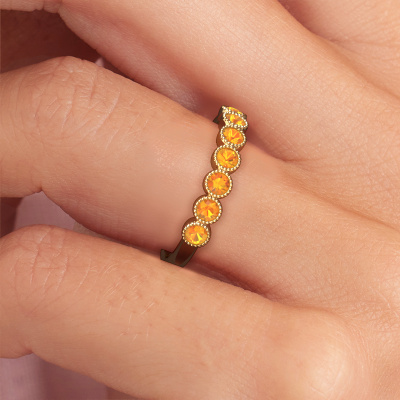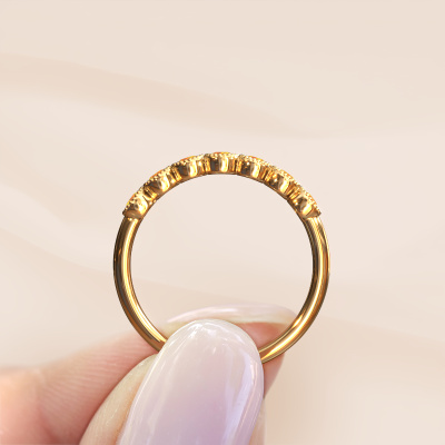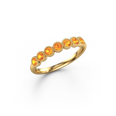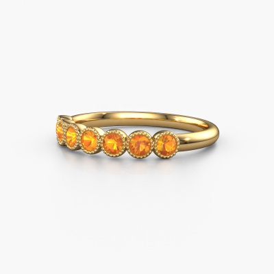 This extraordinary ring is called Mariam half. This type of ring is known as a memoire ring, because it's birthstones are set in a continuous line. This makes it easy to combine with other rings. The band of this 14 Carat gold ring is set in a combination of citrin and citrin 2.4 mm. You can easily choose the combination you prefer online. As you can see, a single citrin is set in this single alliance gold ring. The memoire ring represents collaboration. And that is precisely what these gemstones do, collaborate. Together they add a beautiful effect to the band of a fantasy ring! Such a meaningful ring, wouldn't you agree? All our hand selected citrin are positioned by hand by our expert goldsmith. It's a precise task, which can only be completed successfully through the combination of pure craftsmanship and usage of the latest techniques which give it an optimal effect. To create a perfect reflection of light, all the gemstones have to be perfectly aligned in the same way. During manufacturing, the expert goldsmith will therefore monitor the reflection of light constantly to check whether the citrin are aligned properly. This requires a skilled hand and a lot of patience but then the end product will be a true piece of art. And that is our mission!Are you on a budget? Please feel free to contact us, so we can go discuss your options. We offer our rings at guaranteed best price, because we make them to order. You won't find such a price anywhere else!