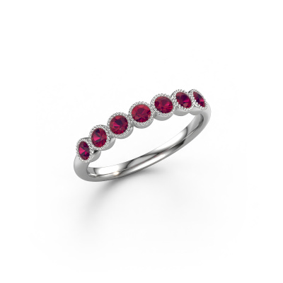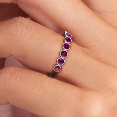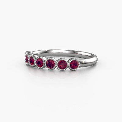 This extraordinary ring is called Mariam half. This type of ring is known as a memoire ring, because it's birthstones are set in a continuous line. This makes it easy to combine with other rings. The band of this platinum ring is set in a combination of rhodolite and rhodolite 2.4 mm. You can easily choose the combination you prefer online. As you can see, a single rhodolite is set in this single alliance platinum ring. The memoire ring represents collaboration. And that is precisely what these gemstones do, collaborate. Together they add a beautiful effect to the band of a fantasy ring! Such a meaningful ring, wouldn't you agree? All our hand selected rhodolite are positioned by hand by our expert goldsmith. It's a precise task, which can only be completed successfully through the combination of pure craftsmanship and usage of the latest techniques which give it an optimal effect. To create a perfect reflection of light, all the gemstones have to be perfectly aligned in the same way. During manufacturing, the expert goldsmith will therefore monitor the reflection of light constantly to check whether the rhodolite are aligned properly. This requires a skilled hand and a lot of patience but then the end product will be a true piece of art. And that is our mission!Are you on a budget? Please feel free to contact us, so we can go discuss your options. We offer our rings at guaranteed best price, because we make them to order. You won't find such a price anywhere else!