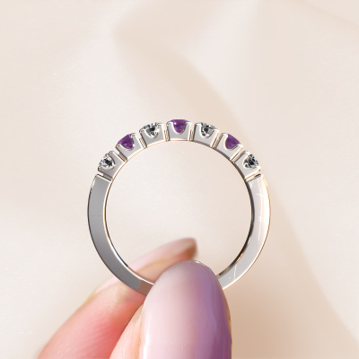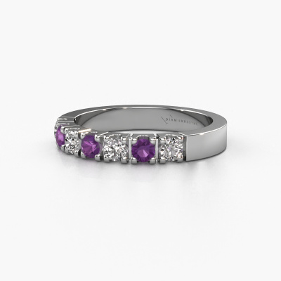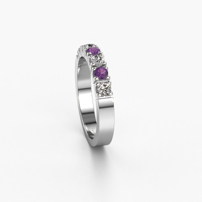 This extraordinary ring is called Dana 7. This type of ring is known as a memoire ring, because its gemstones are set in a continuous line. This makes it easy to combine with other rings. The band of this platinum ring is set in a combination of amethyst and lab grown diamond 3 mm. You can easily choose the combination you prefer online. As you can see, a single amethyst is set in this single alliance platinum ring. The memoire ring represents collaboration. And that is precisely what these gemstones do, collaborate. Together they add a beautiful effect to the band of a modern ring! Such a meaningful ring, wouldn't you agree? All our hand selected amethysten are positioned by hand by our expert goldsmith. It's a precise task, which can only be completed successfully through the combination of pure craftsmanship and usage of the latest techniques which give it an optimal effect. To create a perfect reflection of light, all the gemstones have to be perfectly aligned in the same way. During manufacturing, the expert goldsmith will therefore monitor the reflection of light constantly to check whether the amethysten are aligned properly. This requires a skilled hand and a lot of patience but then the end product will be a true piece of art. And that is our mission!After receiving your order, our goldsmiths will passionately start the creative process of making your ring in our own studio. Because we don't have a big stockpile, these costs will not be passed on to you. Our pricing is proof of that! We offer top quality jewels at lowest price, guaranteed.Our team of talented, passionate designers add new ring designs to our online collection daily. Our objective in doing so, is to be able to offer you a wide variety of jewels. Please feel free to request a quote if you have specific wishes for your ring. We guarantee to make you an offer you can't refuse.To make it easier for you, we offer a 30 day return policy. Check our terms and conditions.