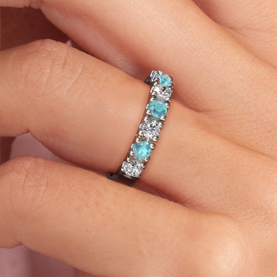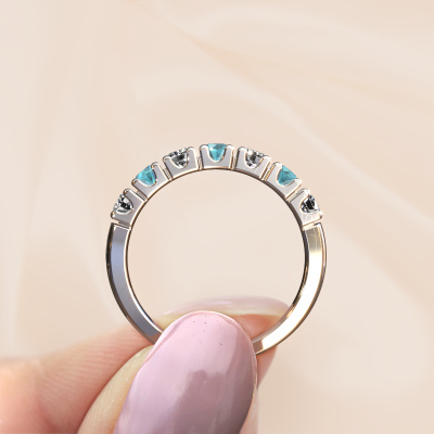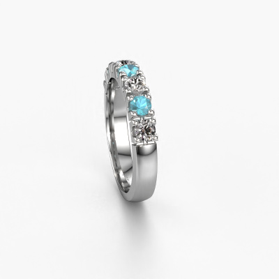 This extraordinary ring is called Rianne 7. This type of ring is known as a memoire ring, because its gemstones are set in a continuous line. This makes it easy to combine with other rings. The band of this platinum ring is set in a combination of blue topaz and lab grown diamond 3 mm. You can easily choose the combination you prefer online. As you can see, a single blue topaz is set in this single alliance platinum ring. The memoire ring represents collaboration. And that is precisely what these gemstones do, collaborate. Together they add a beautiful effect to the band of a traditional ring! Such a meaningful ring, wouldn't you agree? All our hand selected blue topaz are positioned by hand by our expert goldsmith. It's a precise task, which can only be completed successfully through the combination of pure craftsmanship and usage of the latest techniques which give it an optimal effect. To create a perfect reflection of light, all the gemstones have to be perfectly aligned in the same way. During manufacturing, the expert goldsmith will therefore monitor the reflection of light constantly to check whether the blue topaz are aligned properly. This requires a skilled hand and a lot of patience but then the end product will be a true piece of art. And that is our mission!Because we design and deliver our own rings, we can offer you a ring at a price you won't find anywhere else. A ring is made to order, which helps prevent excess supplies, so we can make you a great price offer. We understand it feels risky, buying your ring online, but we will gladly assist in the designing process, taking your budget into consideration.