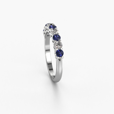 This extraordinary ring is called Michelle 9. This type of ring is known as a memoire ring, because its gemstones are set in a continuous line. This makes it easy to combine with other rings. The band of this platinum ring is set in a combination of sapphire and lab grown diamond 2.7 mm. You can easily choose the combination you prefer online. As you can see, a single sapphire is set in this single alliance platinum ring. The memoire ring represents collaboration. And that is precisely what these gemstones do, collaborate. Together they add a beautiful effect to the band of a classic ring! Such a meaningful ring, wouldn't you agree? All our hand selected sapphire are positioned by hand by our expert goldsmith. It's a precise task, which can only be completed successfully through the combination of pure craftsmanship and usage of the latest techniques which give it an optimal effect. To create a perfect reflection of light, all the gemstones have to be perfectly aligned in the same way. During manufacturing, the expert goldsmith will therefore monitor the reflection of light constantly to check whether the sapphire are aligned properly. This requires a skilled hand and a lot of patience but then the end product will be a true piece of art. And that is our mission!Because we design and deliver our own rings, we can offer you a ring at a price you won't find anywhere else. A ring is made to order, which helps prevent excess supplies, so we can make you a great price offer. We understand it feels risky, buying your ring online, but we will gladly assist in the designing process, taking your budget into consideration.Our team of talented, passionate designers add new ring designs to our online collection daily. Our objective in doing so, is to be able to offer you a wide variety of jewels. Please feel free to request a quote if you have specific wishes for your ring. We guarantee to make you an offer you can't refuse.To make it easier for you, we offer a 30 day return policy. Check our terms and conditions.