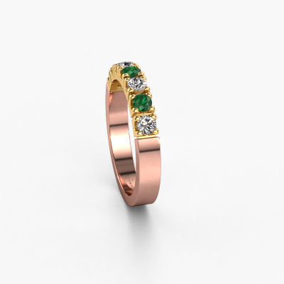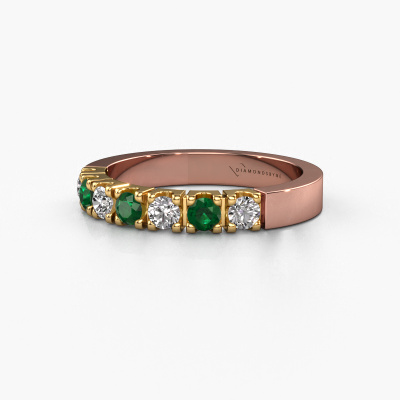 This extraordinary ring is called Dana 7. This type of ring is known as a memoire ring, because its gemstones are set in a continuous line. This makes it easy to combine with other rings. The band of this 14 Carat rose gold ring is set in a combination of emerald and lab grown diamond 3 mm. You can easily choose the combination you prefer online. As you can see, a single emerald is set in this single alliance rose gold ring. The memoire ring represents collaboration. And that is precisely what these gemstones do, collaborate. Together they add a beautiful effect to the band of a modern ring! Such a meaningful ring, wouldn't you agree? All our hand selected emerald are positioned by hand by our expert goldsmith. It's a precise task, which can only be completed successfully through the combination of pure craftsmanship and usage of the latest techniques which give it an optimal effect. To create a perfect reflection of light, all the gemstones have to be perfectly aligned in the same way. During manufacturing, the expert goldsmith will therefore monitor the reflection of light constantly to check whether the emerald are aligned properly. This requires a skilled hand and a lot of patience but then the end product will be a true piece of art. And that is our mission!After receiving your order, our goldsmiths will passionately start the creative process of making your ring in our own studio. Because we don't have a big stockpile, these costs will not be passed on to you. Our pricing is proof of that! We offer top quality jewels at lowest price, guaranteed.Our team of talented, passionate designers add new ring designs to our online collection daily. Our objective in doing so, is to be able to offer you a wide variety of jewels. Please feel free to request a quote if you have specific wishes for your ring. We guarantee to make you an offer you can't refuse.To make it easier for you, we offer a 30 day return policy. Check our terms and conditions.