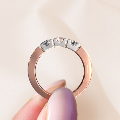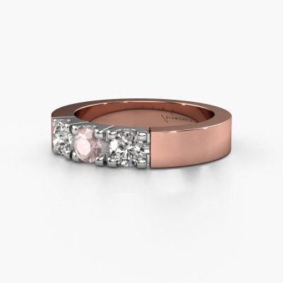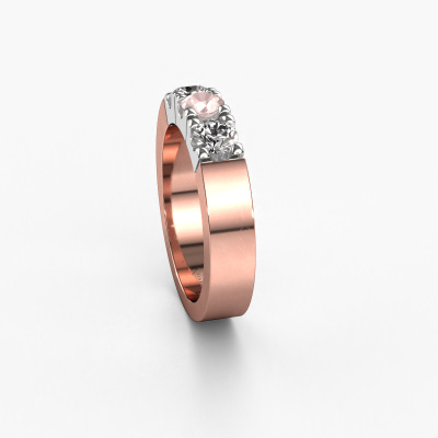 This extraordinary ring is called Dana 3. This type of ring is known as a memoire ring, because its gemstones are set in a continuous line. This makes it easy to combine with other rings. The band of this 14 Carat rose gold ring is set in a combination of morganite champagne and lab grown diamond 4 mm. You can easily choose the combination you prefer online. As you can see, a single morganite champagne is set in this single alliance rose gold ring. The memoire ring represents collaboration. And that is precisely what these gemstones do, collaborate. Together they add a beautiful effect to the band of a modern ring! Such a meaningful ring, wouldn't you agree? All our hand selected morganite champagne are positioned by hand by our expert goldsmith. It's a precise task, which can only be completed successfully through the combination of pure craftsmanship and usage of the latest techniques which give it an optimal effect. To create a perfect reflection of light, all the gemstones have to be perfectly aligned in the same way. During manufacturing, the expert goldsmith will therefore monitor the reflection of light constantly to check whether the morganite champagne are aligned properly. This requires a skilled hand and a lot of patience but then the end product will be a true piece of art. And that is our mission!After receiving your order, our goldsmiths will passionately start the creative process of making your ring in our own studio. Because we don't have a big stockpile, these costs will not be passed on to you. Our pricing is proof of that! We offer top quality jewels at lowest price, guaranteed.Our talented designers add new designs to our online collection daily. Together they create a diverse collection of the finest jewellery. If you prefer to make a ring according your own design, please feel free to request a quote. We will make you an amazing offer, based on quality and price.To make it easier for you, we offer a 30 day return policy. Check our terms and conditions.