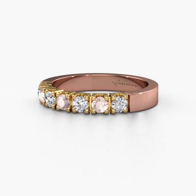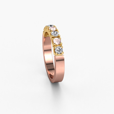This extraordinary ring is called Dana 7. This type of ring is known as a memoire ring, because its gemstones are set in a continuous line. This makes it easy to combine with other rings. The band of this 14 Carat rose gold ring is set in a combination of morganite champagne and lab grown diamond 3 mm. You can easily choose the combination you prefer online. As you can see, a single morganite champagne is set in this single alliance rose gold ring. The memoire ring represents collaboration. And that is precisely what these gemstones do, collaborate. Together they add a beautiful effect to the band of a modern ring! Such a meaningful ring, wouldn't you agree? All our hand selected morganite champagne are positioned by hand by our expert goldsmith. It's a precise task, which can only be completed successfully through the combination of pure craftsmanship and usage of the latest techniques which give it an optimal effect. To create a perfect reflection of light, all the gemstones have to be perfectly aligned in the same way. During manufacturing, the expert goldsmith will therefore monitor the reflection of light constantly to check whether the morganite champagne are aligned properly. This requires a skilled hand and a lot of patience but then the end product will be a true piece of art. And that is our mission!