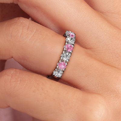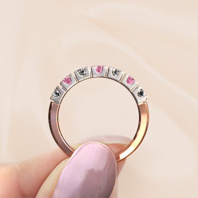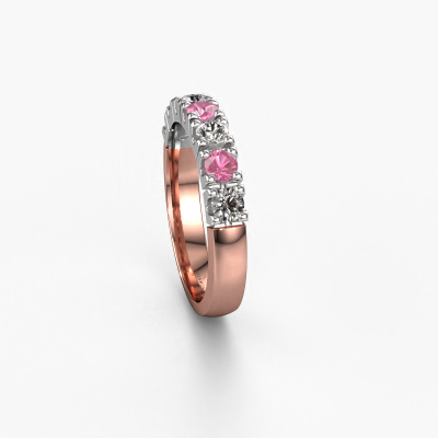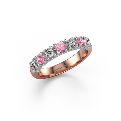 This extraordinary ring is called Rianne 7. This type of ring is known as a memoire ring, because its gemstones are set in a continuous line. This makes it easy to combine with other rings. The band of this 14 Carat rose gold ring is set in a combination of pink sapphire and lab grown diamond 3 mm. You can easily choose the combination you prefer online. As you can see, a single pink sapphire is set in this single alliance rose gold ring. The memoire ring represents collaboration. And that is precisely what these gemstones do, collaborate. Together they add a beautiful effect to the band of a traditional ring! Such a meaningful ring, wouldn't you agree? All our hand selected pink sapphire are positioned by hand by our expert goldsmith. It's a precise task, which can only be completed successfully through the combination of pure craftsmanship and usage of the latest techniques which give it an optimal effect. To create a perfect reflection of light, all the gemstones have to be perfectly aligned in the same way. During manufacturing, the expert goldsmith will therefore monitor the reflection of light constantly to check whether the pink sapphire are aligned properly. This requires a skilled hand and a lot of patience but then the end product will be a true piece of art. And that is our mission!Because we design and deliver our own rings, we can offer you a ring at a price you won't find anywhere else. A ring is made to order, which helps prevent excess supplies, so we can make you a great price offer. We understand it feels risky, buying your ring online, but we will gladly assist in the designing process, taking your budget into consideration.