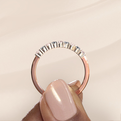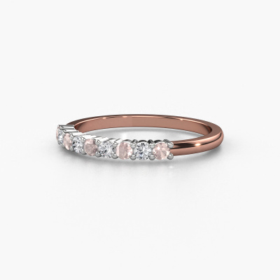 This extraordinary ring is called Yasmin 9. This type of ring is known as a memoire ring, because its gemstones are set in a continuous line. This makes it easy to combine with other rings. The band of this 14 Carat rose gold ring is set in a combination of morganite champagne and diamond 2.4 mm. You can easily choose the combination you prefer online. As you can see, a single morganite champagne is set in this single alliance rose gold ring. The memoire ring represents collaboration. And that is precisely what these gemstones do, collaborate. Together they add a beautiful effect to the band of a classic ring! Such a meaningful ring, wouldn't you agree? All our hand selected morganite champagne are positioned by hand by our expert goldsmith. It's a precise task, which can only be completed successfully through the combination of pure craftsmanship and usage of the latest techniques which give it an optimal effect. To create a perfect reflection of light, all the gemstones have to be perfectly aligned in the same way. During manufacturing, the expert goldsmith will therefore monitor the reflection of light constantly to check whether the morganite champagne are aligned properly. This requires a skilled hand and a lot of patience but then the end product will be a true piece of art. And that is our mission!