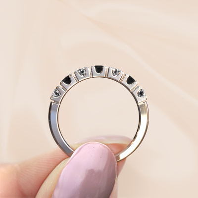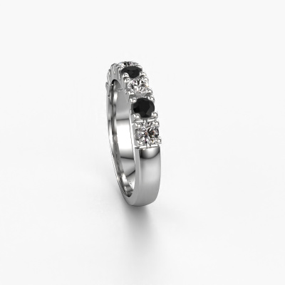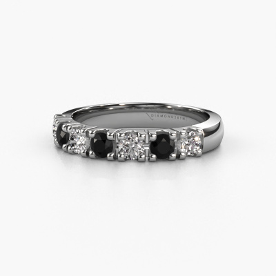 This extraordinary ring is called Rianne 7. This type of ring is known as a memoire ring, because its gemstones are set in a continuous line. This makes it easy to combine with other rings. The band of this 14 Carat white gold ring is set in a combination of black diamond and lab grown diamond 0.76 crt. You can easily choose the combination you prefer online. As you can see, a single black diamond is set in this single alliance white gold ring. The memoire ring represents collaboration. And that is precisely what these gemstones do, collaborate. Together they add a beautiful effect to the band of a traditional ring! Such a meaningful ring, wouldn't you agree? All our hand selected black diamonds are positioned by hand by our expert goldsmith. It's a precise task, which can only be completed successfully through the combination of pure craftsmanship and usage of the latest techniques which give it an optimal effect. To create a perfect reflection of light, all the gemstones have to be perfectly aligned in the same way. During manufacturing, the expert goldsmith will therefore monitor the reflection of light constantly to check whether the black diamonds are aligned properly. This requires a skilled hand and a lot of patience but then the end product will be a true piece of art. And that is our mission!Because we design and deliver our own rings, we can offer you a ring at a price you won't find anywhere else. A ring is made to order, which helps prevent excess supplies, so we can make you a great price offer. We understand it feels risky, buying your ring online, but we will gladly assist in the designing process, taking your budget into consideration.