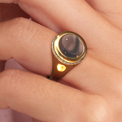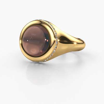 In this photo the gold Lesli RND ring is set with a cabochon smokey quartz. Cabochon means a smokey quartz is shaped first, not faceted, into a specific shape, such as a drop, heart or round cabochon. Subsequently, it is polished until the gemstone has a orb shaped surface. A cabochon gemstone is a stunning, classy eye-catcher that matches perfectly with a contemporary as well as a vintage style. Our expert goldsmiths shape the beautiful ring to perfection which makes it unique. The cabochon smokey quartz is set so its unique qualities are strengthened. The best part of this beautiful ring is that you can customize it to your own liking. Your style, your choice, your ring. On top of that, your modern gold ring will be made by hand with eco-friendly materials! Please feel free to easily customize the ring, using our online tool.After receiving your order, our goldsmiths will passionately start the creative process of making your ring in our own studio. Because we don't have a big stockpile, these costs will not be passed on to you. Our pricing is proof of that! We offer top quality jewels at lowest price, guaranteed.To make it easier for you, we offer a 30 day return policy. Check our terms and conditions.