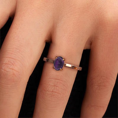 In this photo the rose gold Mallie 1 ring is set with a cabochon amethyst. Cabochon means a amethyst is shaped first, not faceted, into a specific shape, such as a drop, heart or oval cabochon. Subsequently, it is polished until the gemstone has a orb shaped surface. A cabochon gemstone is a stunning, classy eye-catcher that matches perfectly with a contemporary as well as a vintage style. Our expert goldsmiths shape the tasteful ring to perfection which makes it unique. The cabochon amethyst is set so its unique qualities are strengthened. As soon as you finished designing your Mallie 1 ring with our online tool, our goldsmiths will start their creative process of making your ring. This will be done with passion and care, according ancient crafting. On top of that, our jewels are made of eco-friendly materials. Simply customize online with our online tool, if you want any changes made. If you want specific changes made to your Mallie 1 ring, that are unavailable in our online tool, please feel free to contact our expert designers.After receiving your order, our goldsmiths will passionately start the creative process of making your ring in our own studio. Because we don't have a big stockpile, these costs will not be passed on to you. Our pricing is proof of that! We offer top quality jewels at lowest price, guaranteed.To make it easier for you, we offer a 30 day return policy. Check our terms and conditions.