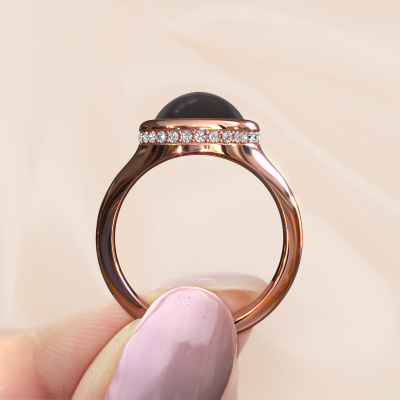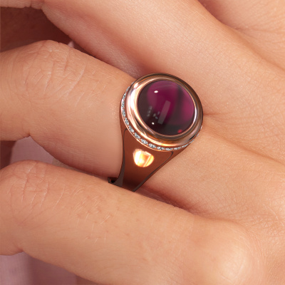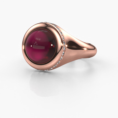 In this photo the rose gold Lesli RND ring is set with a cabochon garnet. Cabochon means a garnet is shaped first, not faceted, into a specific shape, such as a drop, heart or round cabochon. Subsequently, it is polished until the gemstone has a orb shaped surface. A cabochon gemstone is a stunning, classy eye-catcher that matches perfectly with a contemporary as well as a vintage style. Our expert goldsmiths shape the beautiful ring to perfection which makes it unique. The cabochon garnet is set so its unique qualities are strengthened. The best part of this beautiful ring is that you can customize it to your own liking. Your style, your choice, your ring. On top of that, your modern rose gold ring will be made by hand with eco-friendly materials! Please feel free to easily customize the ring, using our online tool.After receiving your order, our goldsmiths will passionately start the creative process of making your ring in our own studio. Because we don't have a big stockpile, these costs will not be passed on to you. Our pricing is proof of that! We offer top quality jewels at lowest price, guaranteed.To make it easier for you, we offer a 30 day return policy. Check our terms and conditions.